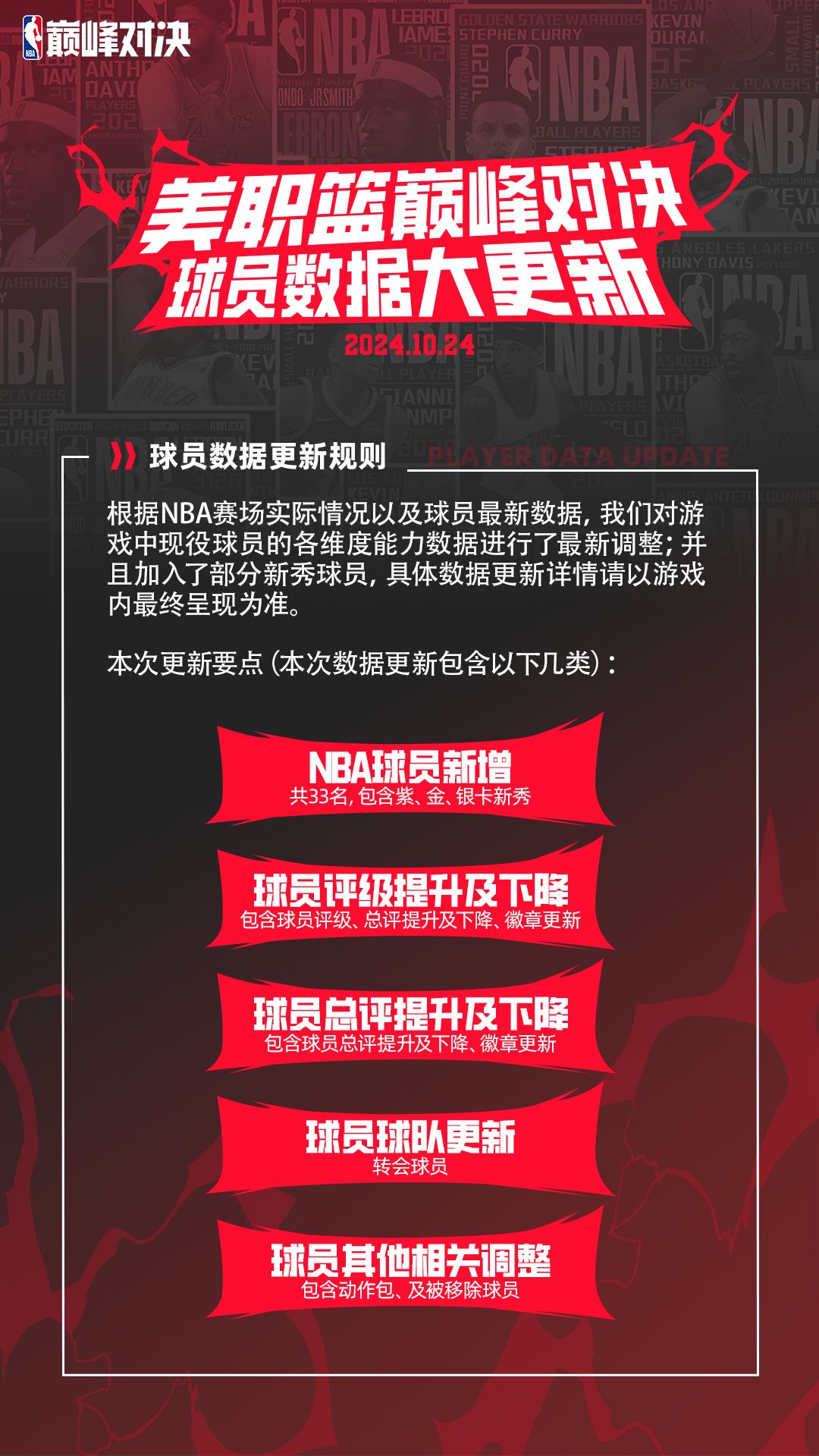 重磅!《美职篮巅峰对决》球员数据大更新!速来查看!