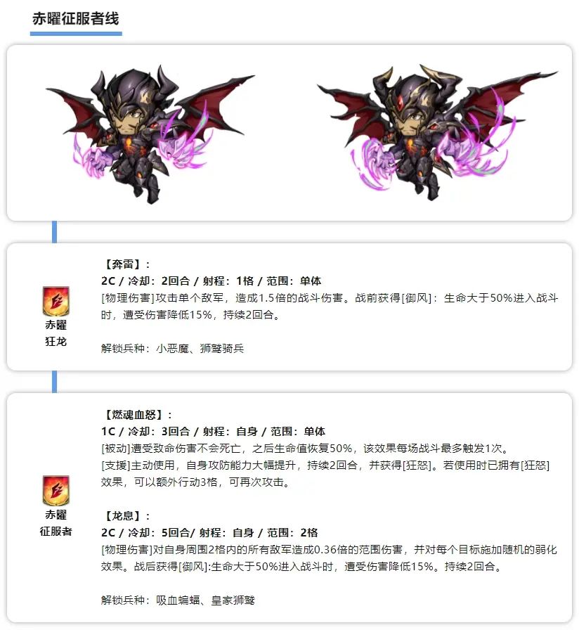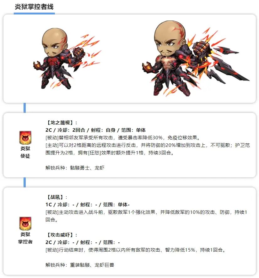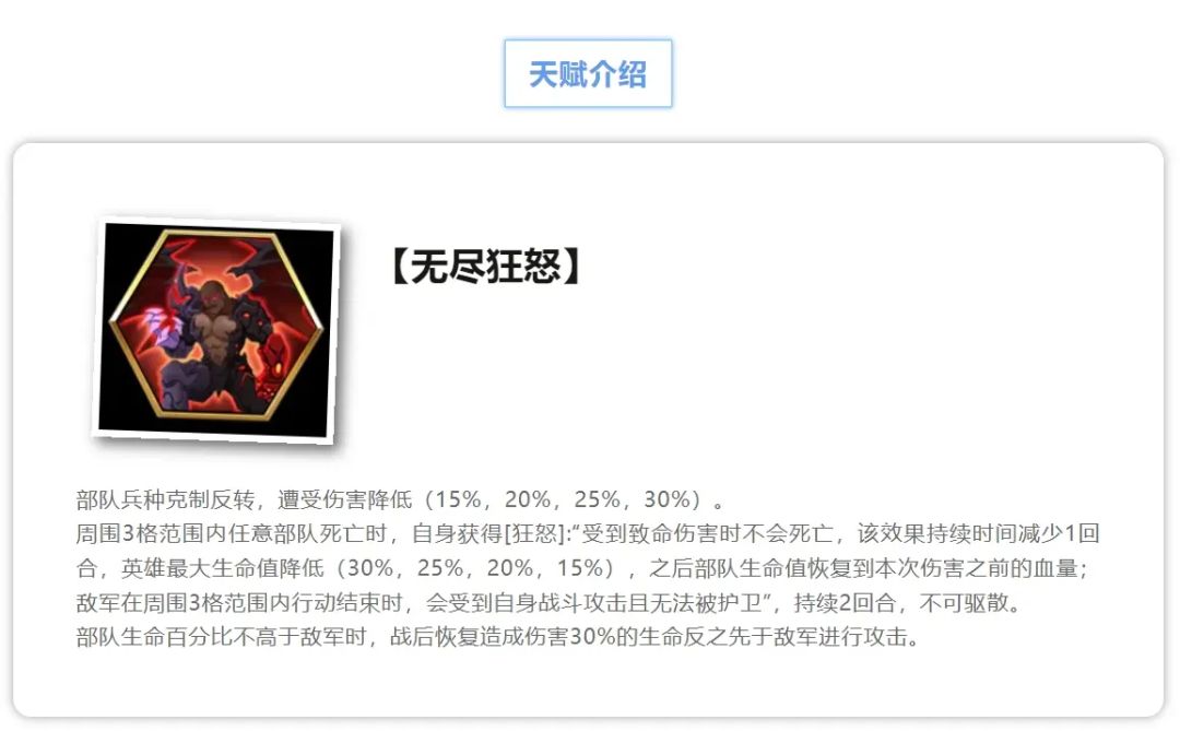 - 炎龙破灭者的天赋较为复杂,全是新机制。主要是周围部队死亡时可以进入狂怒状态,自动无视护卫攻击身边行动结束的敌人,还不会死亡。此外还有减伤、克制反转、战后回血或先攻等能力。