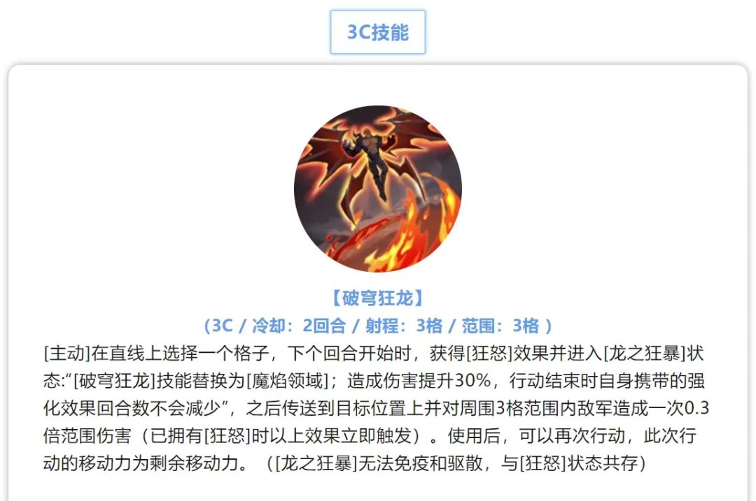- 3C技能破穹狂龙/魔焰领域,是一个切换类技能。初始状态为标记加突进技能,下回合开始时会跳到标记点炸一下,并获得狂怒和30%增伤。如果已经是狂怒状态,则升级为立即跳过去,加30%增伤,炸一下,并再动。炸完后,技能会切换为可以扒装备的单点技能。