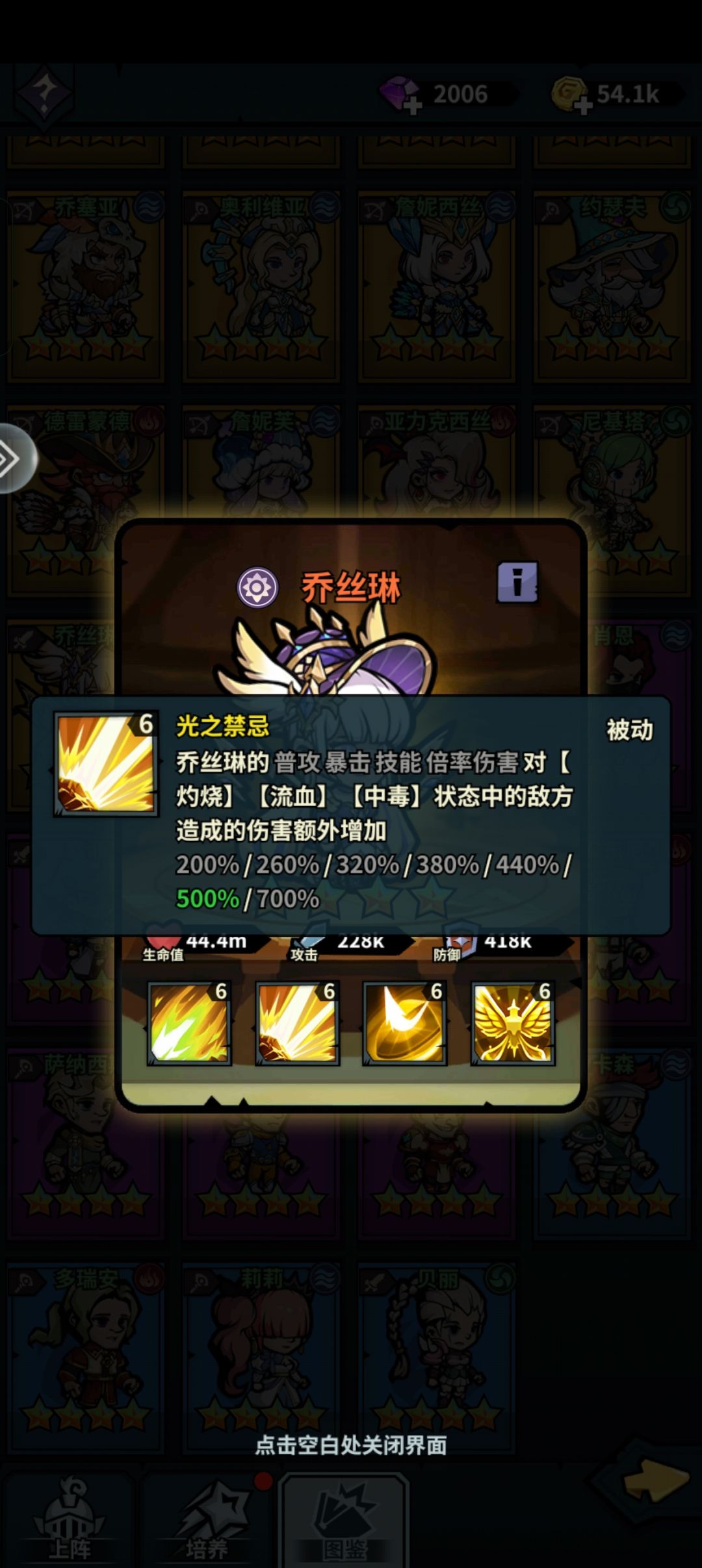 乔丝琳 【光系】 输出 核心技能【光之禁忌】 对负面状态的敌人造成额外伤害。大部分金色佣兵只对单个负面状态生效增伤,乔丝琳对三个状态生效,这就是强度,乔丝琳单体技能加成是目前最高的,满级高达百分之4000。