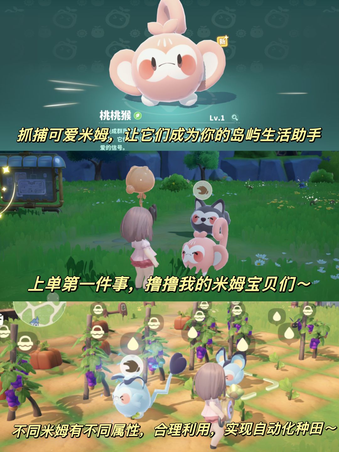 “米姆”是游戏中造型圆润可爱的精灵生物,玩家可以在探索过程中捕捉它们,让其成为自己的伙伴。不同的米姆具有不同的外观、习性和能力,玩家需要种植米姆喜爱的食物来喂养它们,米姆通过进食可以生产晶石资源等,还可以使用糖果道具使米姆进化,进化后的米姆能力会更强大。