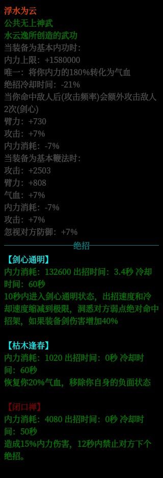 内功:冷却时间百分比在可添加的顺次第一位,中间三条为臂力和攻击%,和破防/内耗,最后一条则是剑心词条(自创融合的剑心通明需要词条才能完全生效,才会有绝对格挡的效果)