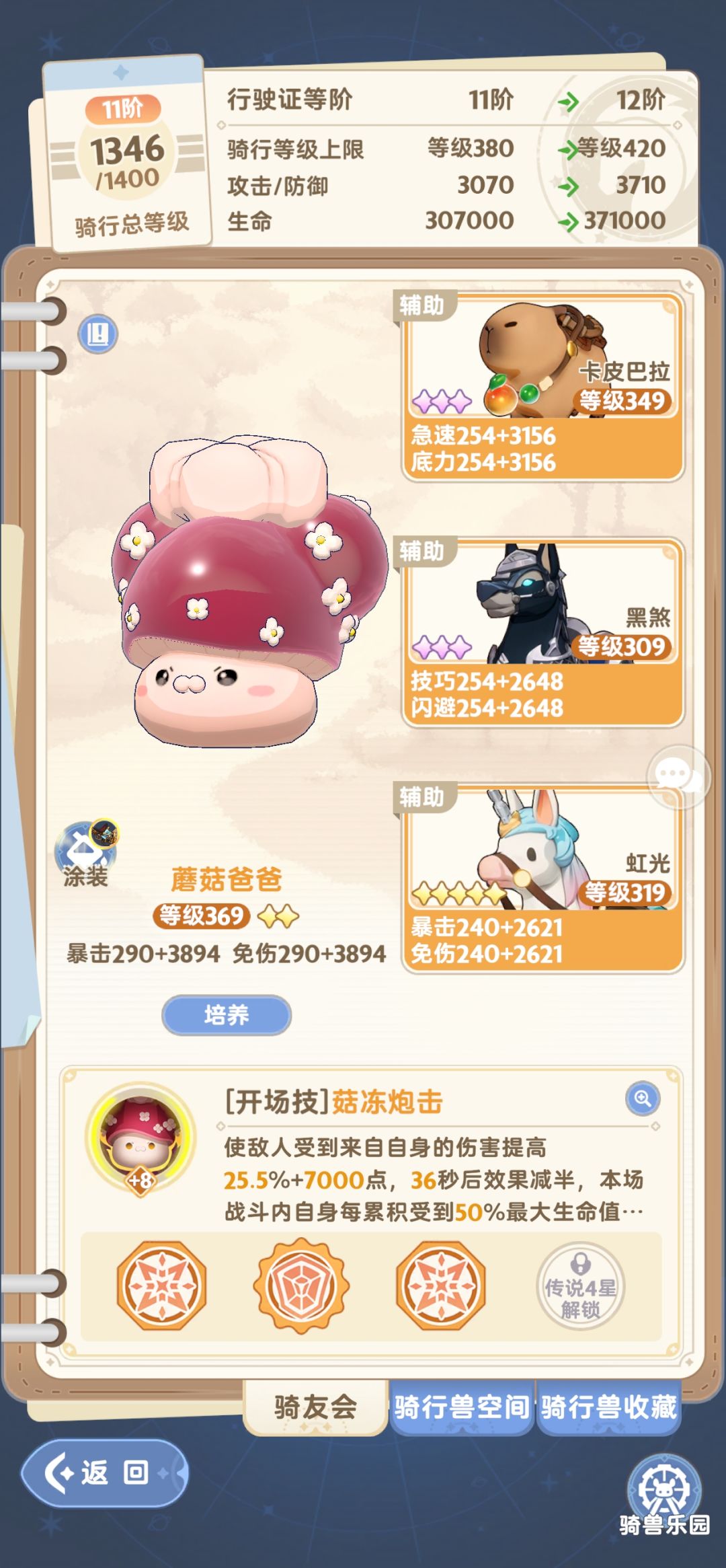 因为刚四转的时候面板掉的极多,所以骑宠需要双暴击支撑,另外两只一只狗子一只全能或者急速,急速其实伤害增幅一般,因为核心技能伤害并不是四转战士主要伤害,主要在于两个被动技能,所以暴击技巧依然是最高优先级。