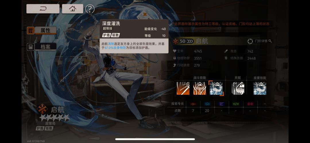 五星角色:启航的大招和支援技能都可以做到驱散的效果。如果和红心组队的话,要确保他能够即使驱散掉压制效果,这样的话,应该也能有高额的伤害输出。
