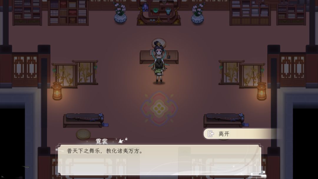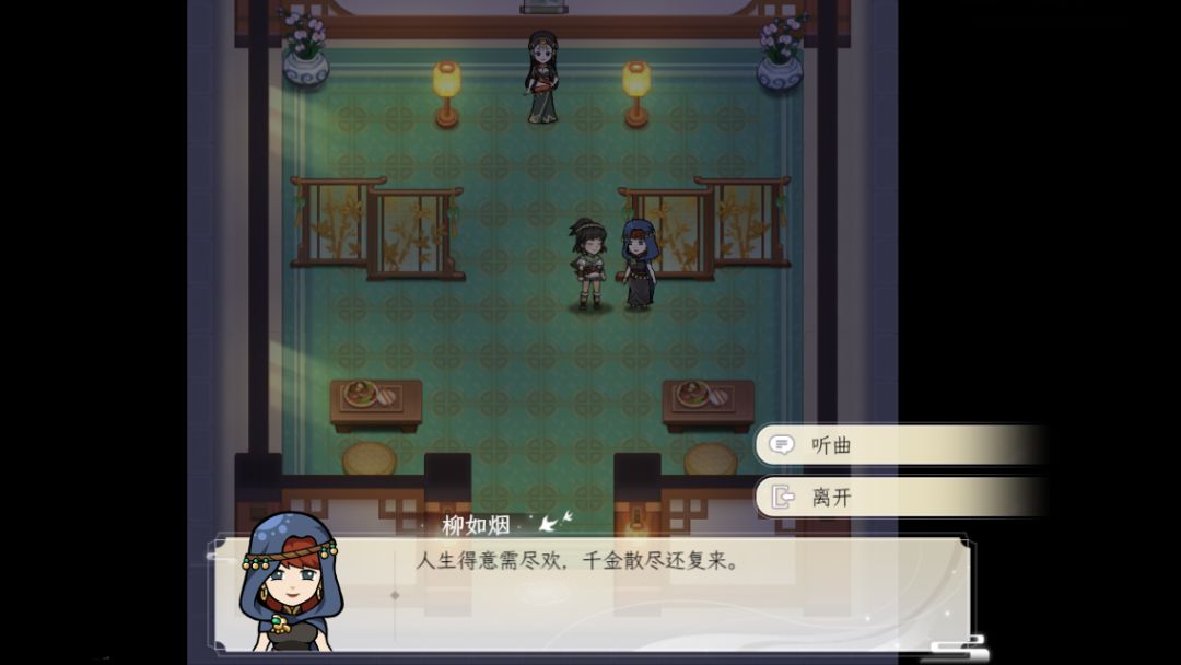 【乾阳】有一个建筑【忘忧轩】,进入后和房间内的npc交互,花费铜钱100听曲,可以重新花钱切换曲目。