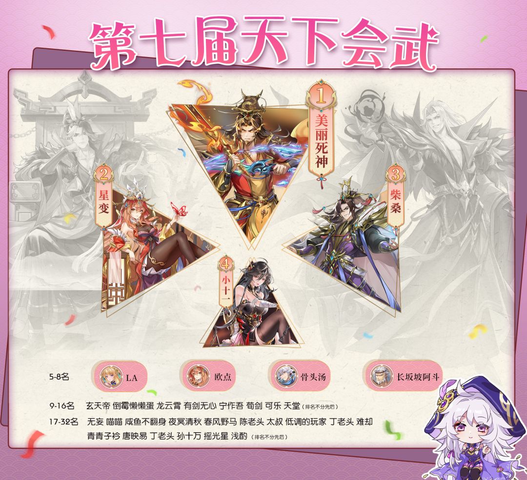 星变、柴桑、小十一分别夺得2-4名,本次活动又有新面孔挤入四强,袁绍玩家首次冲击四强成功,可喜可贺,希望下期活动再接再厉
