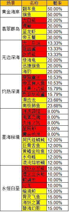 钓起高级鱼后,对应各类鱼的详细概率如下: