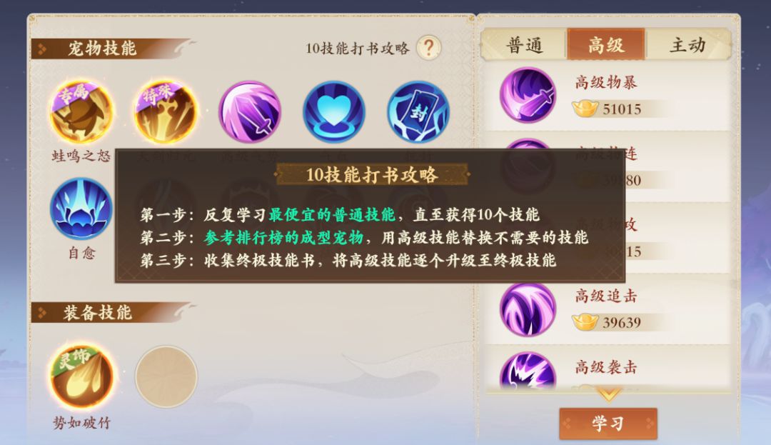 用蓝色技能书开出剩下8个技能槽→考虑好决定宠物发展的路线和技能→打高级技能书→终极技能书