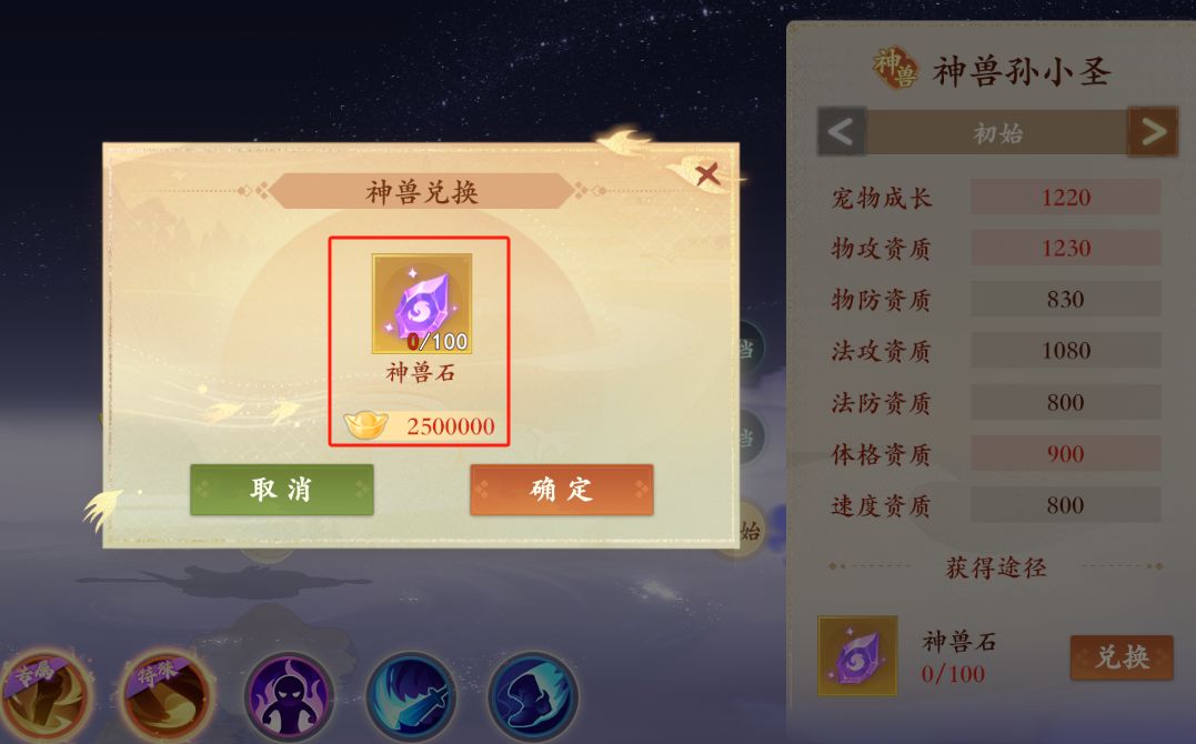100神兽石可以兑换任何一只神兽:需要250W元宝;