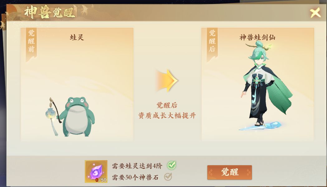 蛙剑仙:物理、群攻;0氪,资质略不如孙小圣和狐狸,但有限,可平替,完成任务赠送,需50神兽石才可觉醒,相对亲民;