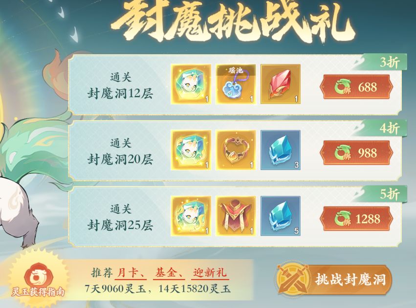 四不相:法术、单攻;0氪,资质略不如孙小圣和狐狸,但有限,可平替,由6元首充鹿灵进阶完成,需要买下封魔挑战礼后,才可觉醒,相对亲民;