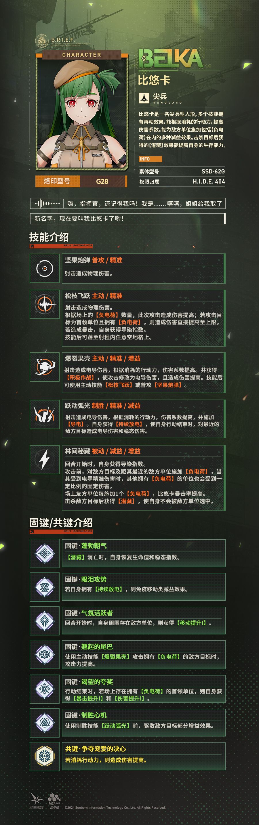 比悠卡是一名尖兵型人形,多个技能拥有再动效果,能根据消耗的行动力,提高伤害系数。能为敌方单位施加包括【负电荷】在内的多种减益效果。击杀目标后获得的【潜藏】效果能提高自身的生存能力。详情请看下图。