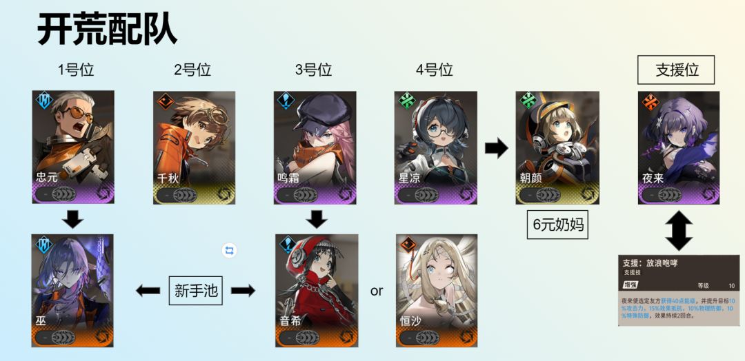 我们可以根据新手池的情况进行替换,如巫可以替换掉忠元,音希或者恒沙可以替换掉鸣霜,6元的奶妈朝颜可以替换掉星凉。