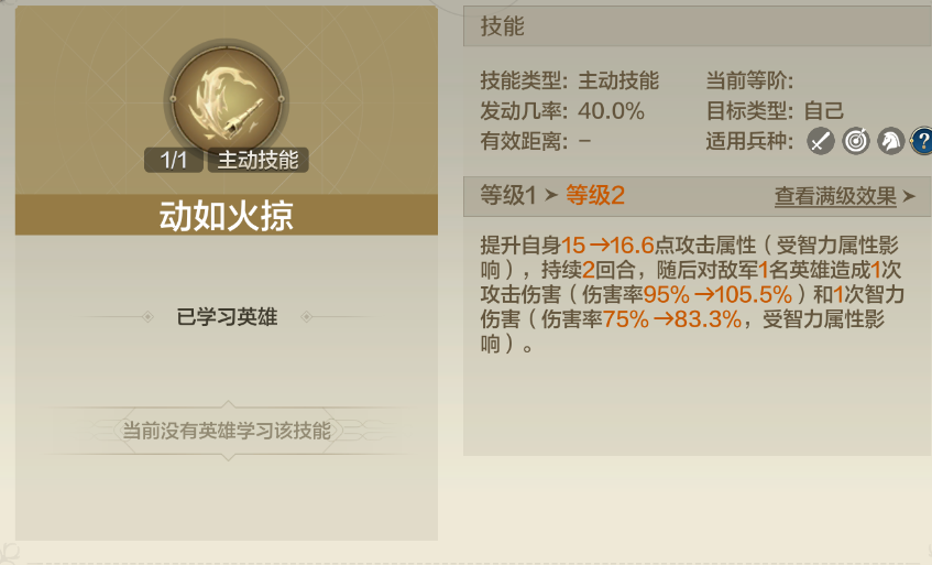 技能描述:每回合行动时有40%概率对敌军统帅和前锋分别造成一次攻击伤害(伤害率75%~150%),同时我军智力最高的英雄对随机2名敌军造成一次智力伤害(伤害率75%~150%,受智力属性影响)。