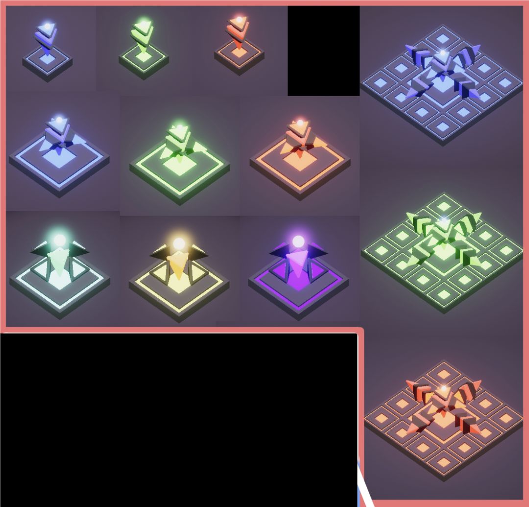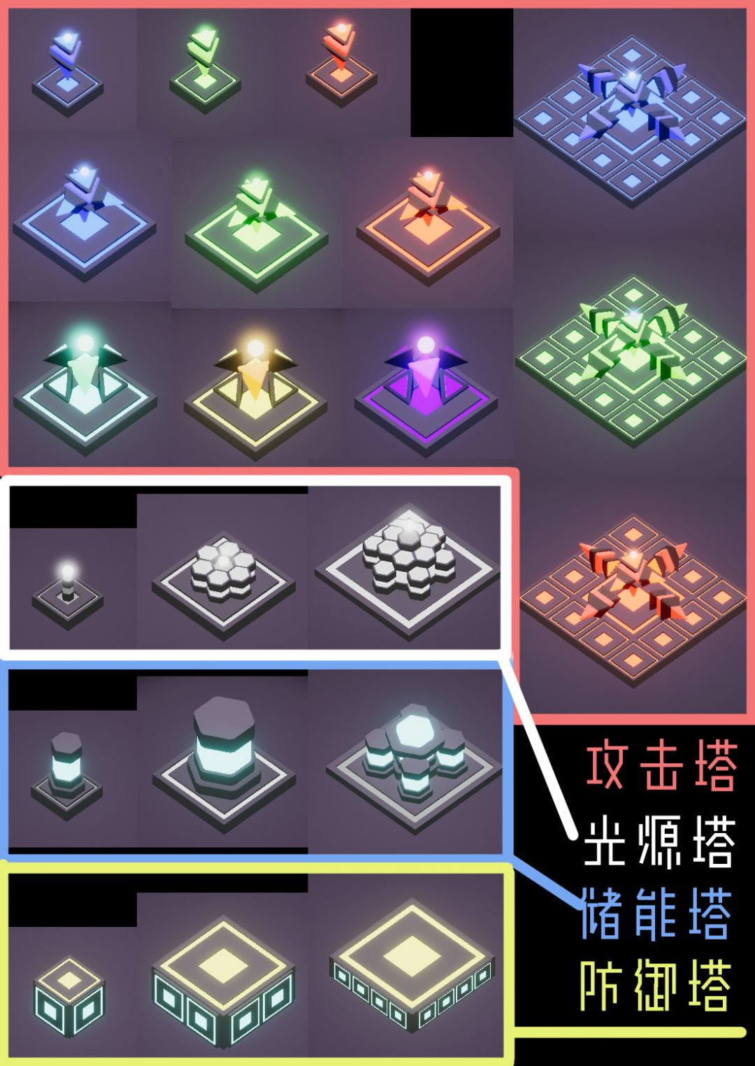 在多版的塔型修改下。综合了功能和贴近光的主题的取舍,我们把塔的类型分成了以下几种: