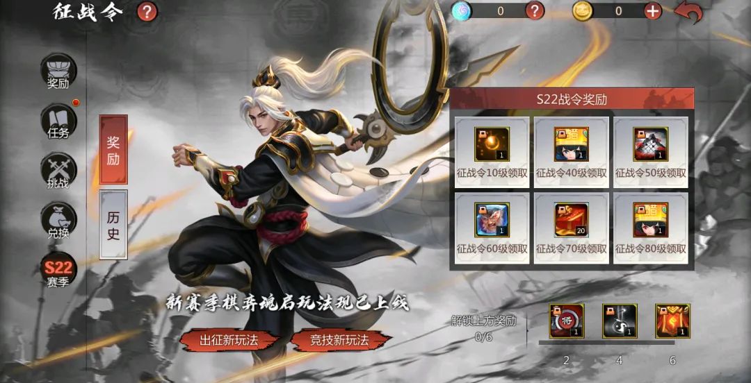 赛季征程额外奖励!!当征战令等级达到10、40、50、60、70、80级时,会解锁上述的6项奖励,而当累计解锁2、4、6项上述奖励时,还能额外获得下方进度条的三项奖励——水岭注奇物*天下为棋、传送*黑白双生(7天)、称号*天下为棋!!该界面内点击下方按钮还可查看新赛季主题的竞技与出征最新玩法机制介绍。
