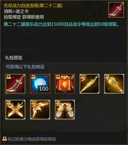 征战令达到50级后,将同步开启竞技终极挑战。达成对应的战力/官渡等级要求,可获得超豪华的无双战力自选宝箱、官渡段位自选宝箱——单手武器-象意无双刀*无双、称号*娱乐大圆满、鸿蒙*淬神系列武器五件套(60天)随心带走!!