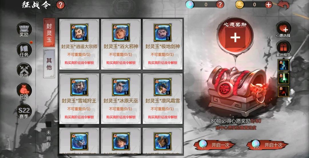 封灵玉奖励其他奖励如果没有解锁高阶征战令,仙术师也可使用竞技之魂在心愿宝箱中选取并抽取心愿奖励,保底抽中的奖励必为自己选中的心愿奖励,且心愿可随时更换!