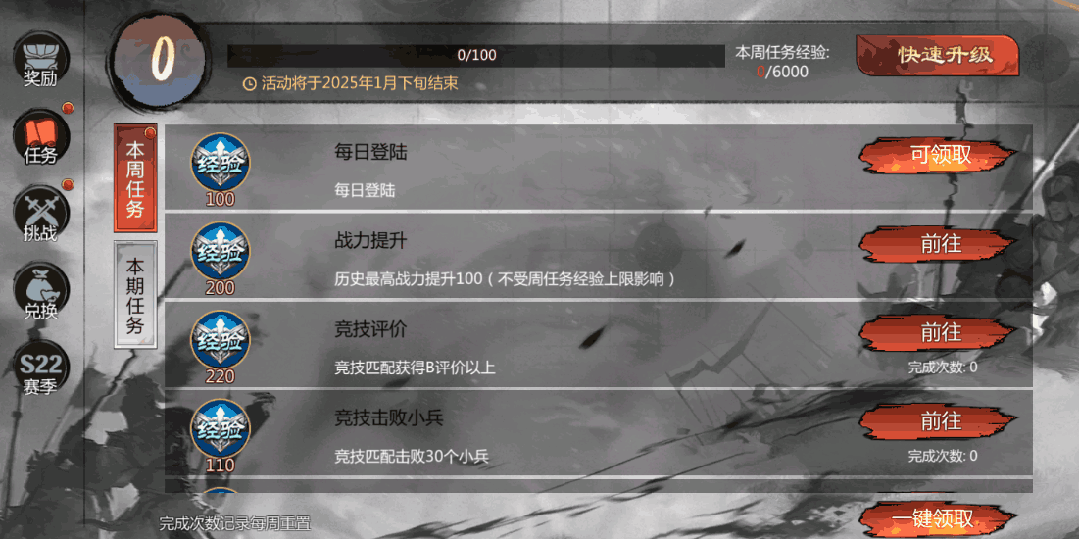 征战令任务共有两种:本周任务、本期任务。本周任务将在每周一0点更新,本期任务获得的征战令经验不受每周任务经验上限影响。