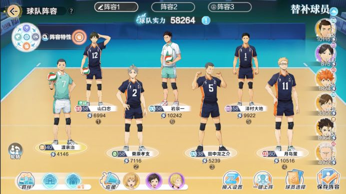 开局阵容如下,岩泉新手招募选,10次的情况下可以多刷新几次,岩泉正常能出两次(要真非那当我没说),有两个SR就可以拿下了,如果岩泉加单SR有suga或者山口一定要拿,月岛抽一只,大地7天送,田中位置选任意一个不是练习服的SR,最推荐缘下力,更好去凑一下羁绊,这个学校羁绊可有可无,不用强求。上他的话就和岩泉换个位置,旭也可以但是得养个替补主攻先,主要是看2500彩钻会出谁,谁都要养,这是后面调整的重点。7天前没有大地的时候,除了练习服大地都可以养,因为连战对决要两队,你养的都能用,SR还是可着谁出的多用谁,高共鸣的情况下属性都不差。
