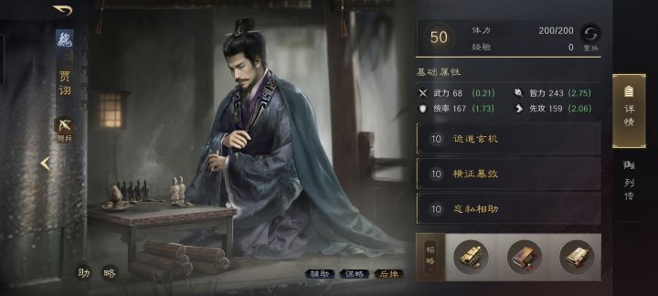 按照体质来说,贾诩并不适合做前排当肉盾,不过他的群体混乱天赋,使之足以乱中求稳。再学习两个治疗战法,更能保证全队的续航。