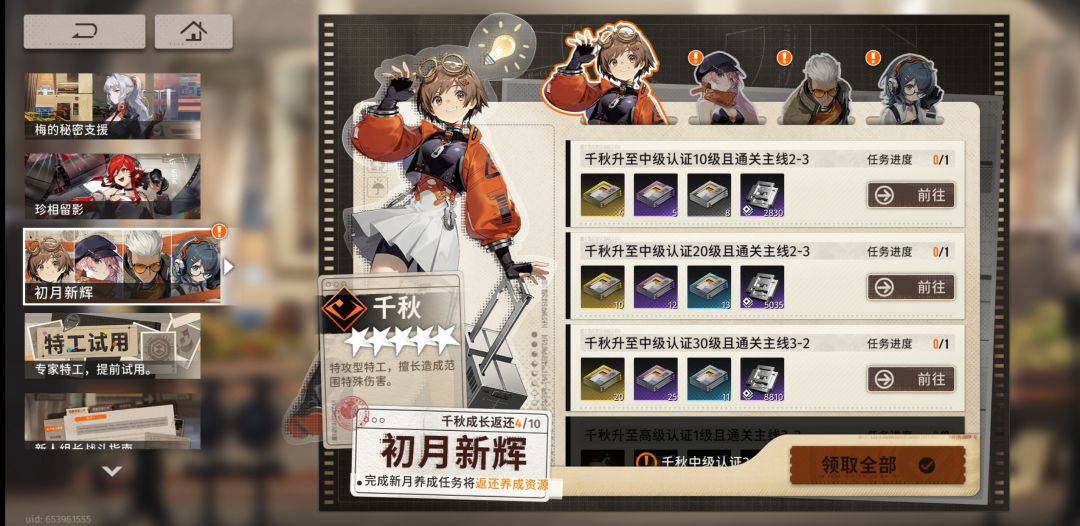 - 升级时优先升级御四家:【千秋】,【鸣霜】,【忠元】,【星凉】,活动会返还所有养成资源,前面用来支援最好不过