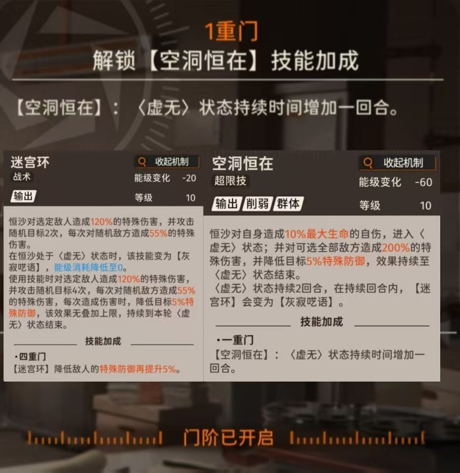 - 【恒沙】:法系输出,虚无状态下对敌叠加减法防无上限,对多时随机群攻,对单时伤害也很足。缺点是大招耗能高,启动慢,要一门解锁“虚无状态持续时间增加一回合”后,才有大力培养的必要