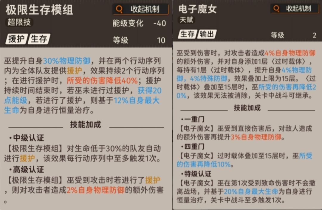 - 【巫】:游戏内目前最强的援护T,加队防减敌攻,天赋挨打加防御,叠满15层还有减伤,并且自带反伤和回复,高等级后还可以免死一次,总之非常全面