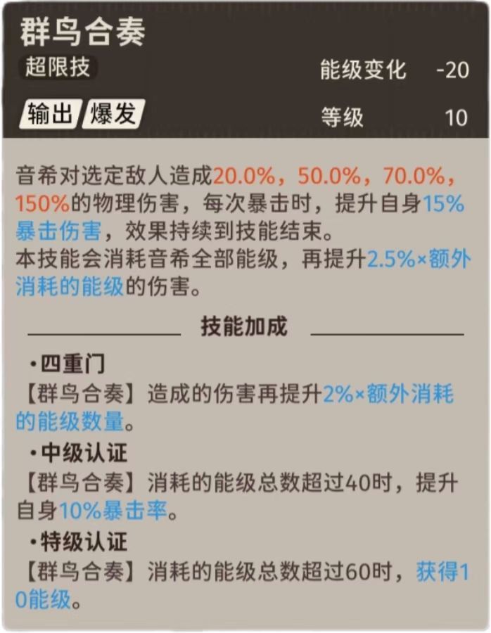 - 【音希】:前期暴击不足表现会差一点,后面暴击堆起来,上限极高,拥有极致的单体物理输出伤害