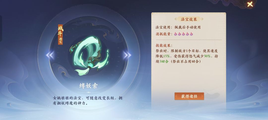 因素3:法宝,缚妖索可以对敌方速度造成一定的短暂的限制效果。