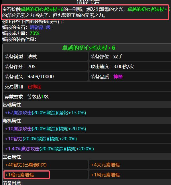 现在装备镶嵌有【+1光元素增强】,如果此时再镶嵌暗元素,则【+1光元素增强】会变为【+暗元素】,如下图