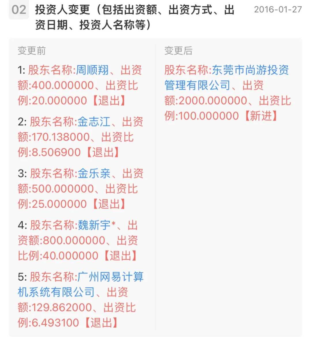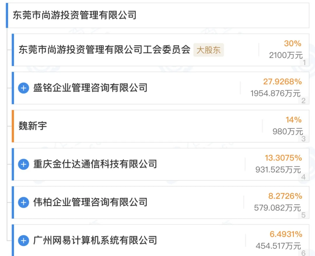 2016年,尚游网络做了一次工商变更,由新主体东莞尚游投资管理有限公司100%持股。东莞尚游投资的注册地址就在步步高总部,除了几家老股东以及总经理魏新宇个人持股之外,东莞尚游投资最大的股东(持股30%),是公司工会。