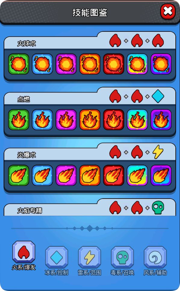 游戏内技能系统,主要由火,冰,雷,毒,风五个元素进行三三组合方式,,玩家可以根据自己的属性优缺点,进行自由的组合,搭配使用五个技能。