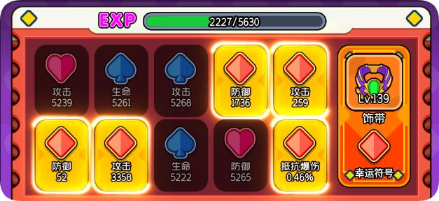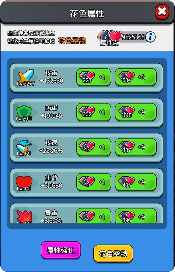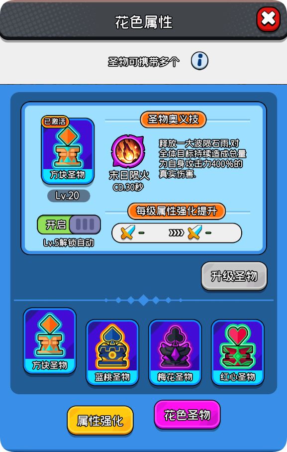花色属性,是通过刮刮卡的中奖花色的数量来提升的一条重要基础属性,在游戏前期有着至关重要的作用,除了提供多种属性的数值和百分比的加成之外,还可以开启新的圣物技能。