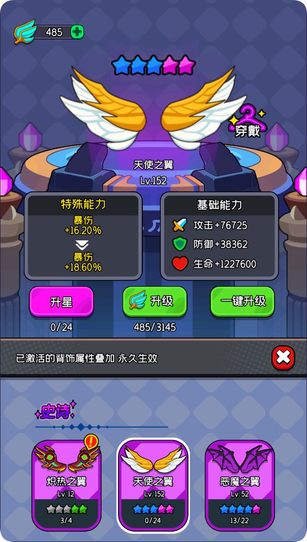 背饰系统,在游戏中期,可以为玩家提供非常多的数值加成,并且在整体外形上,也有多种搭配效果,同皮肤一样,开启多种翅膀也会加成到人物身上,就会使玩家在外形的选择上,完全根据自己的心意进行变化而不会影响战斗力!