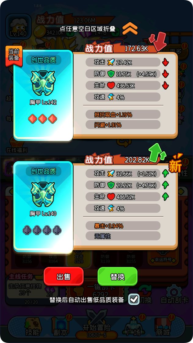 当您获得战力值更高的装备时,不用犹豫点击替换即可!
