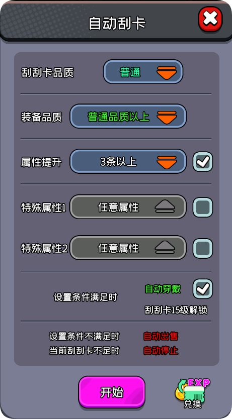 大家在游玩过程中,可以通过主界面“一键刮卡”或者自动刮卡随机刮出不同品质的装备,切换使用高级刮卡能够高几率获得更好的装备,这里推荐您勾选属性提升3条以上的。
