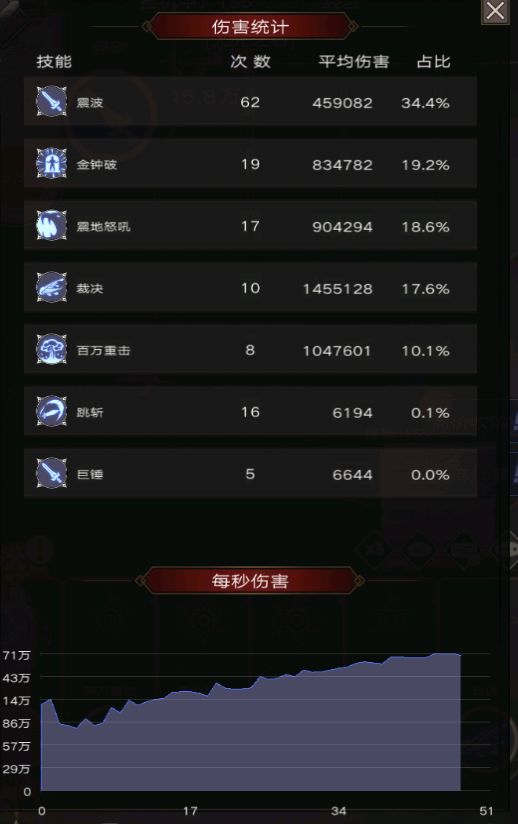 6.7.兵装7星后,通过高格挡+以静制动,震波伤害占比很高,提高了大盾对群能力。