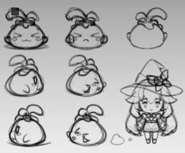 主角确定:上回书说道~故事背景为一个害怕阴影的种族为了种族而踏上冒险旅途,可是在我们队伍讨论过程中觉得这样有点平平无奇,不如让史莱姆当魔女吧(奇怪想法的诞生),于是和美术大大一拍即合,有了如下角色产出:
