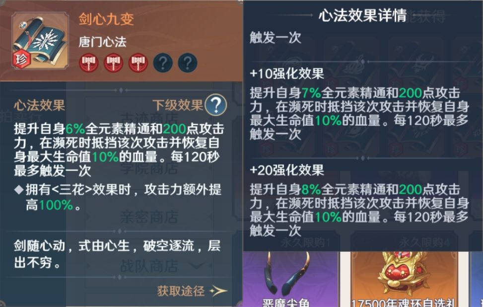唐门心法由心法效果、蕴含神识和主属性和若干随机副属性组成。