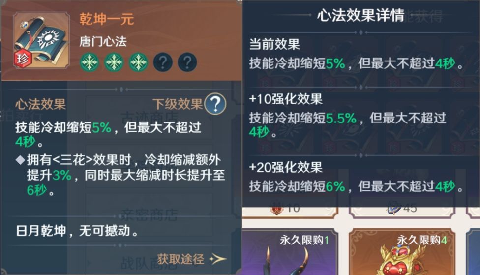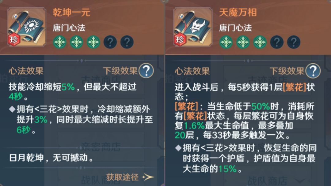 唐门心法有蓝色、紫色、橙色(普通/珍品)三种品质,最大等级分别为5/15/25级。