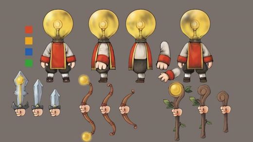 设计灵感:首先,因为这次的比赛的主题有“光”,那我们自然想到了能产生“光”的物体,特别是在黑暗中能人们带来光的事物。而经常能表现出想出主义的符号恰好是能发光的灯泡。所以便让拟人的灯泡作为了游戏的角色。