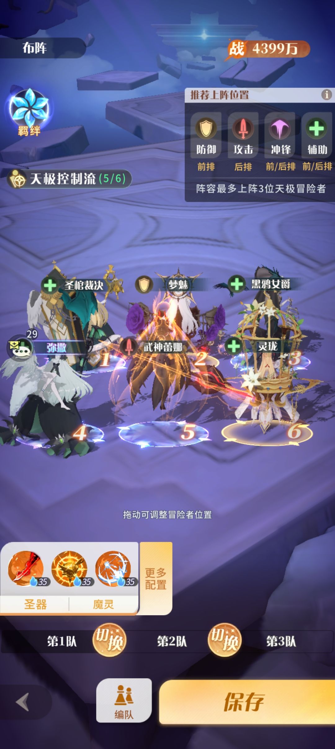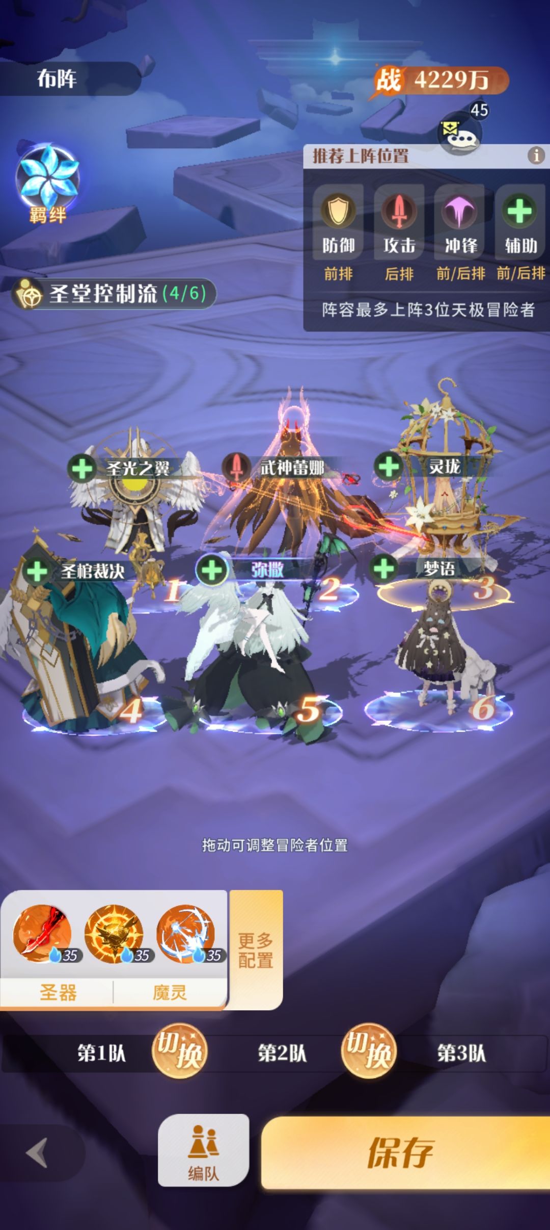 ①号位:圣光之翼(坦度高+控制+降能量, SSR5可用,UR5四柱试炼1V1强无敌)