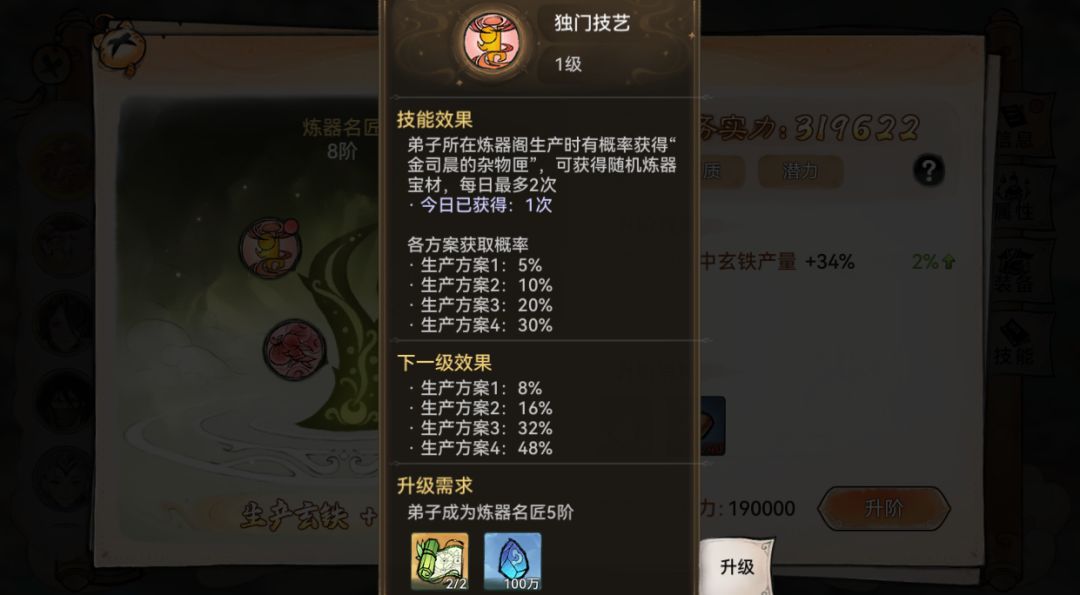拥有金司晨的小伙伴们需要注意了,购买获得该弟子后,将其设置为掌门,再把等级拉到炼虚七阶即可消耗【天工图录】来激活第三个技能——独门技艺。
