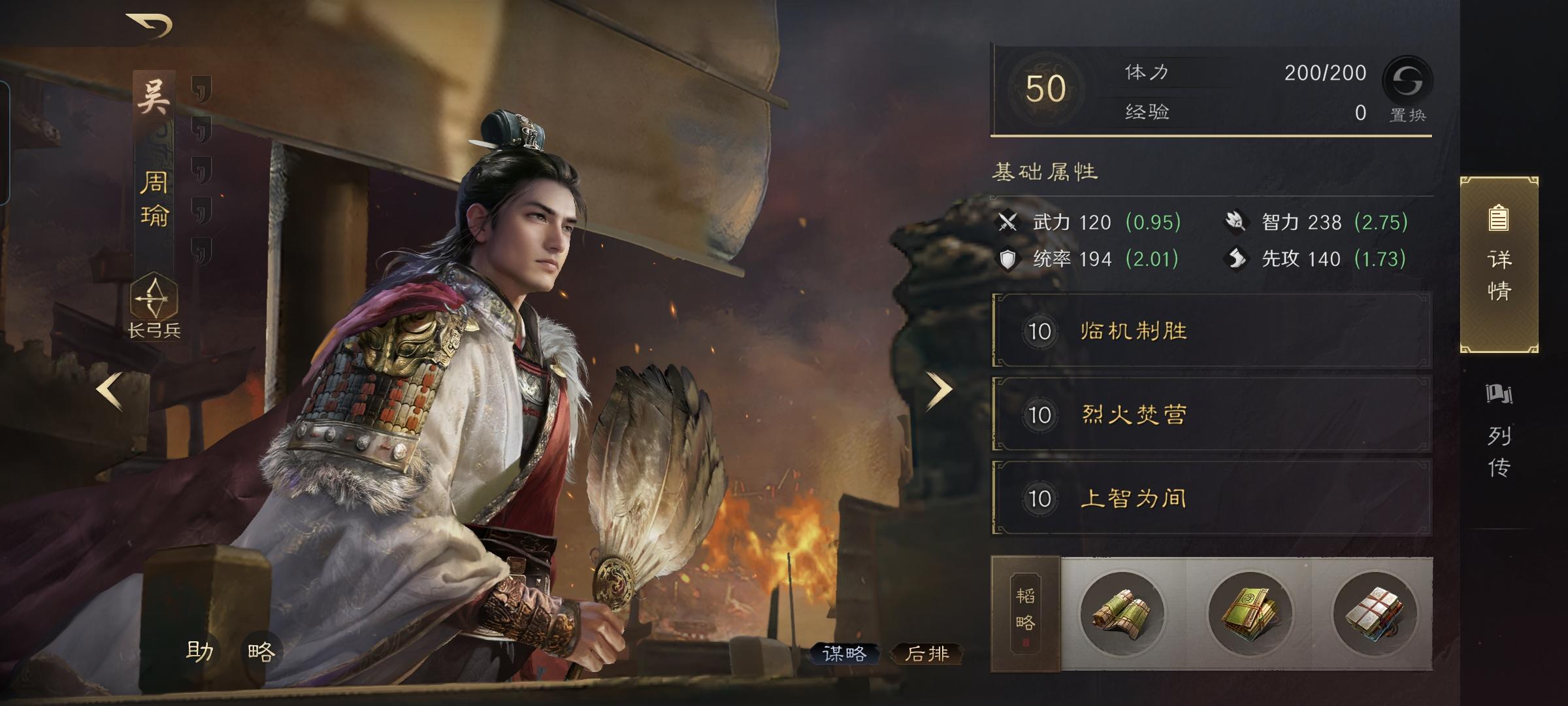周瑜战法:临机制胜+烈火焚营+上智为间。韬略库:避险手抄+火计(专属)+虎翼善本。长弓兵特性洞悉,专精点亮袍泽同心。
