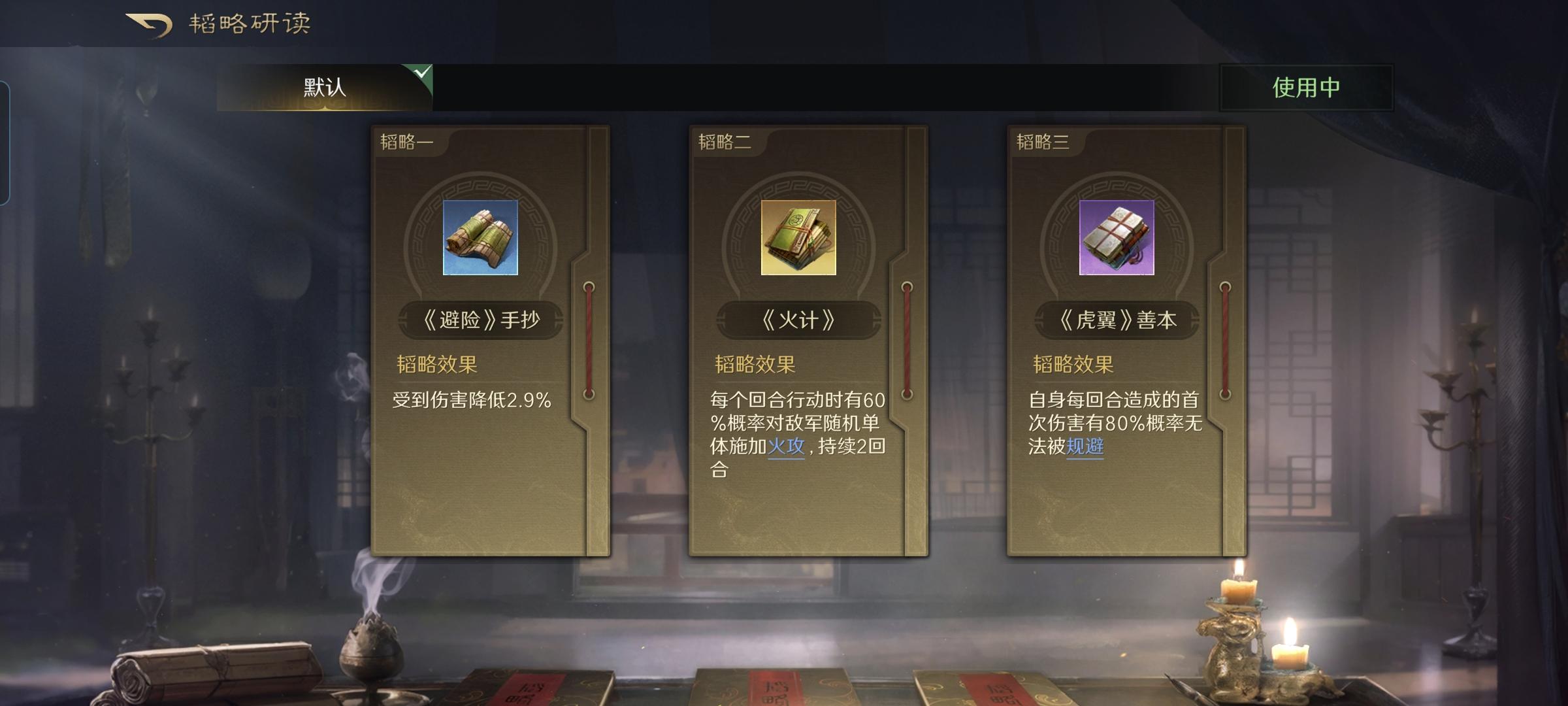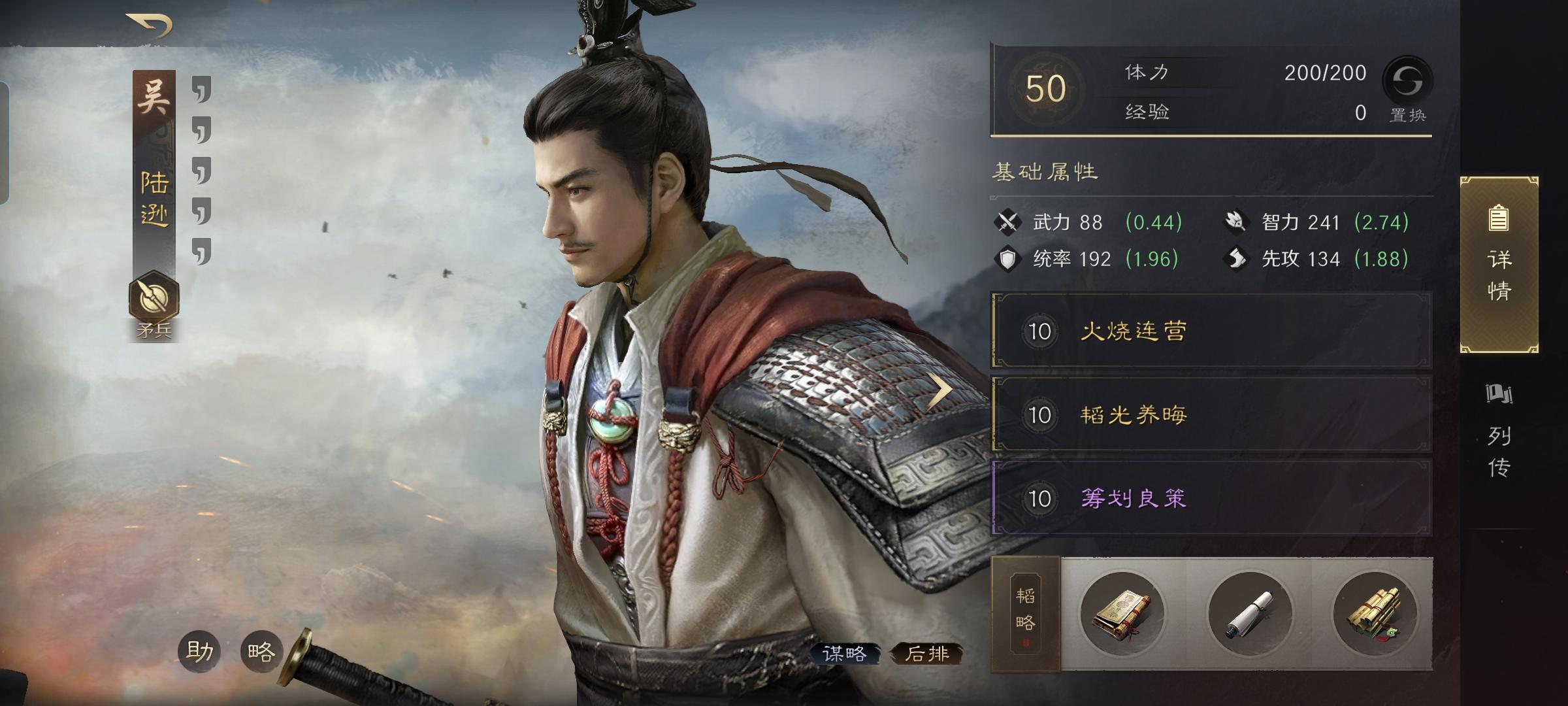 鲁肃战法:划湘分荆+束手无策+屈人之兵。韬略库:鬼谋善本+治国论(专属)+避险善本。长枪兵特性破敌,专精点亮愈战愈勇。