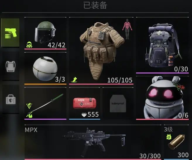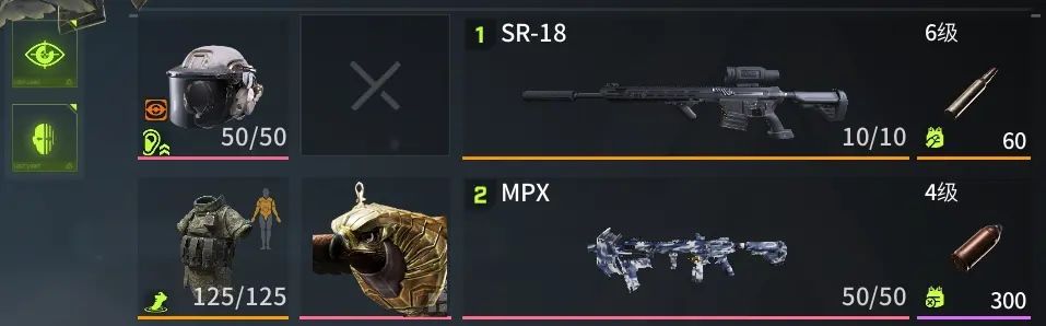 狙击流往往需要一击命中,因此装备的配置上不能节省,背包尽可能选择最大,主武器选择顺手的金色品质狙击步枪加6级弹,副武器选择射速快的冲锋枪,头盔、护甲优先选择防护能力更强的5级、6级。