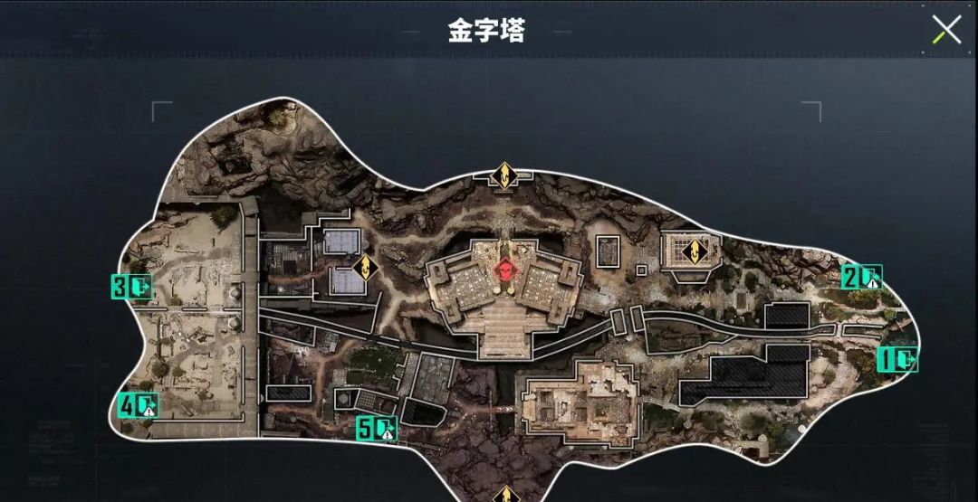 金字塔地图共分为5个部分,分别是最西侧的1号区域【赤沙前哨】、西南侧的2号区域【赤沙训练场】、北侧的3号区域【主墓】、东南侧的4号区域【丰收广场】和最东侧5号区域【鹰神码头】,玩家进入游戏时可以在1号区域和5号区域选择出生点。