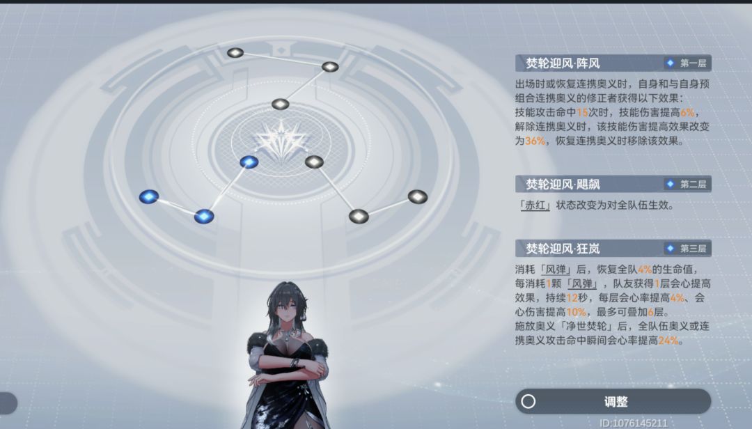 蓝线(辅助线)死绑梵天 自身及连携对象技伤提高36% 红枪buff全队共享 最多30%风伤(专武60%) 消耗子弹全队回血 同时队友获得暴击/爆伤buff 最多24%暴击60%爆伤 自身释放单人奥义 全队奥义/连携暴击率提高244%