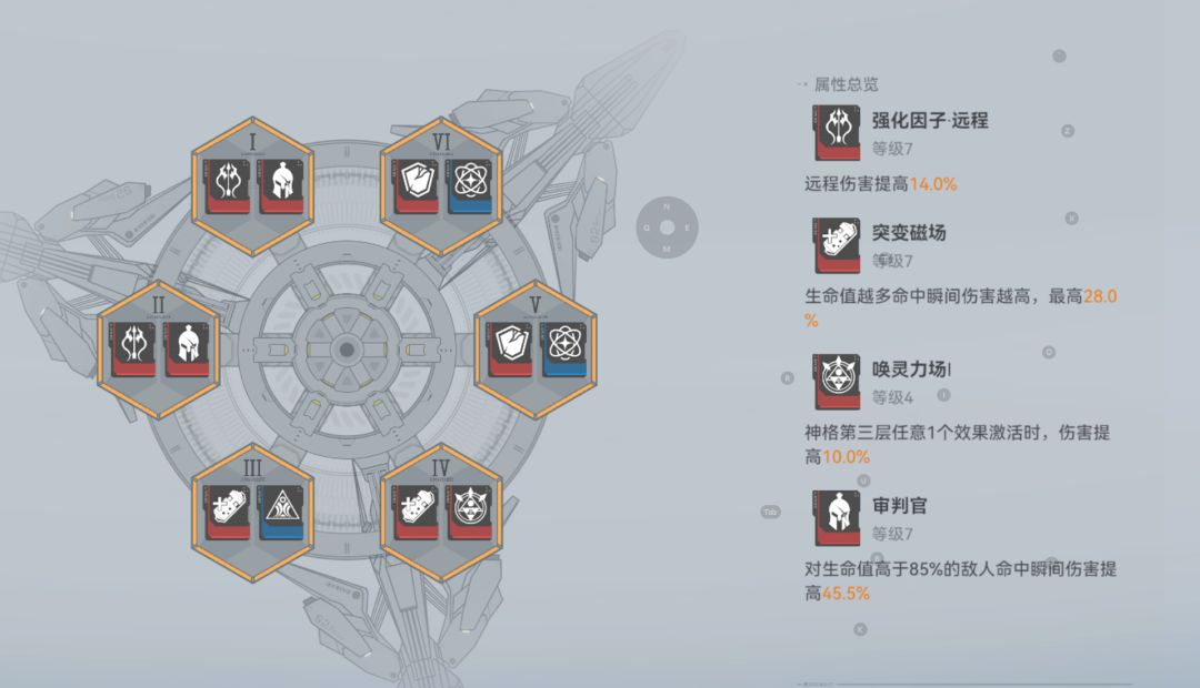 12位置 近战6+审判6 34位置 奥义充能6+突变6 56位置 破甲6+开局神能6(也可以少点一组奥义充能 但是启动晚1-2秒)